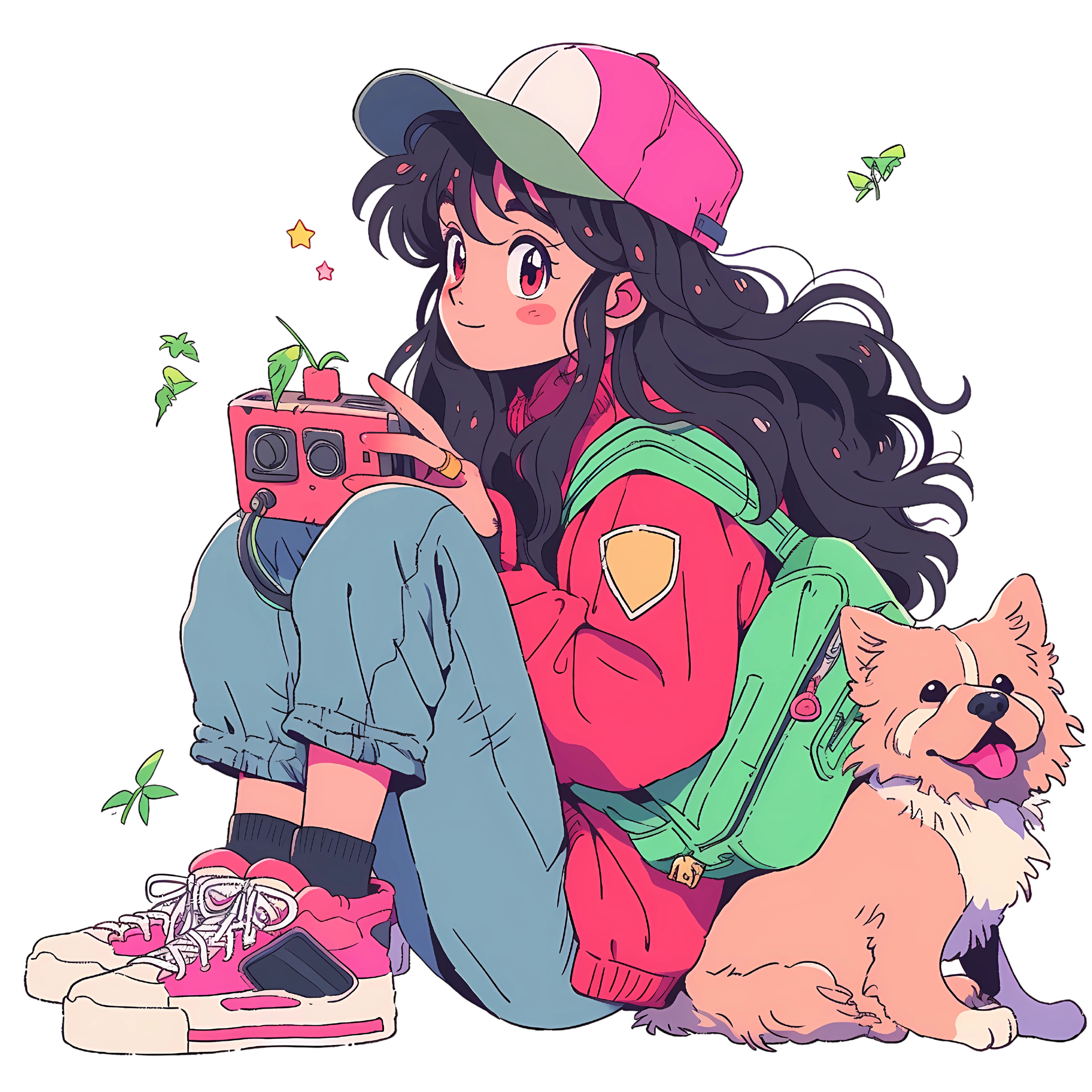 La ilustración presenta a una chica con consola retro, gorra y mochila, acompañada por un perrito adorable. Todo el conjunto respira estilo y ternura, con una paleta suave y vibrante a la vez.